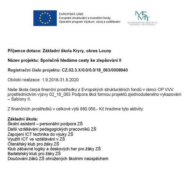 Naše škola čerpá finanční prostředky z Evropských strukturálních fondů v rámci OP VVV prostřednictvím výzby 02_16_063 Podpora škol formou projektů zjednodušeného vykazování - Šablony II.